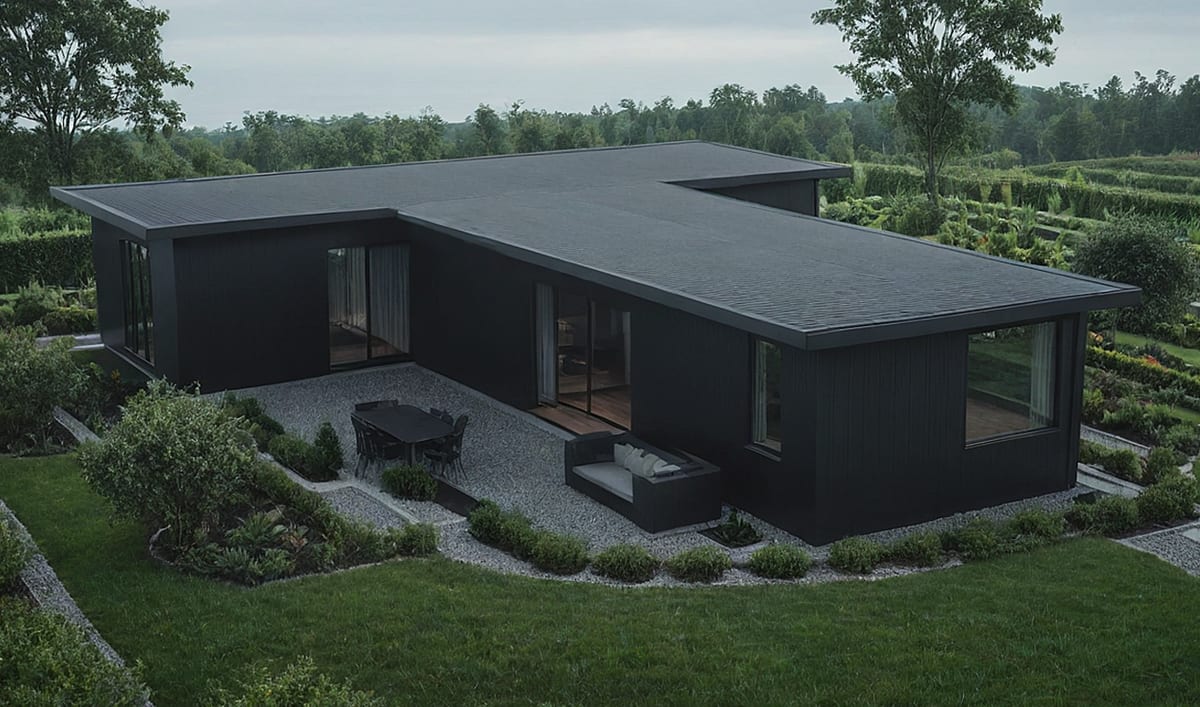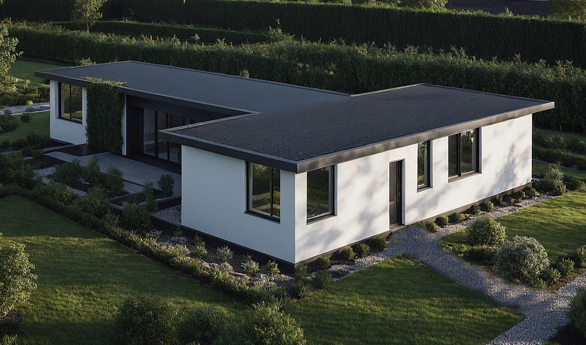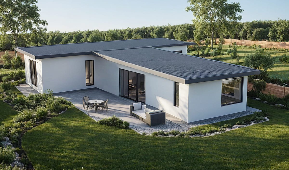 Designový dům tvaru písmene T s elegantním řešením. SPA zóna, zastřešená terasa a dvě koupelny.